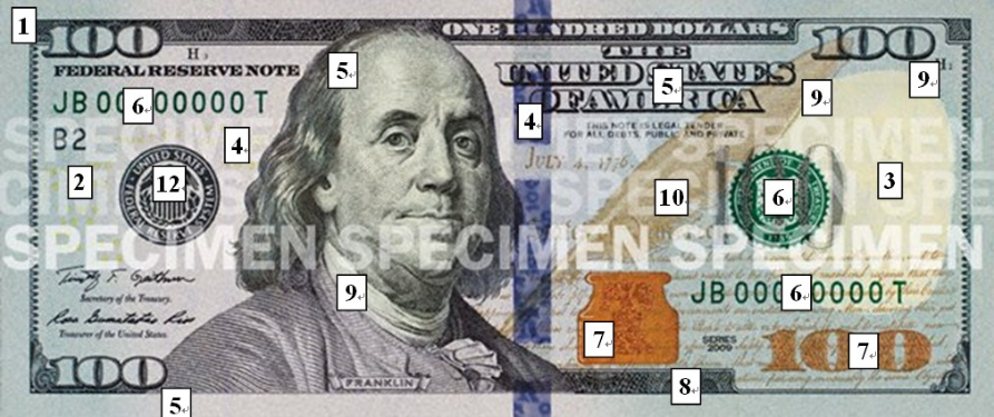 67.彩钞版5美元纸币迎光透视,在纸币( )号位,可看到安全线上印有缩微文字“USA FIVE”和美国国旗图案,且美国国旗内放置了一个面额数字“5”,该数字极其微小但印刷非常清晰。