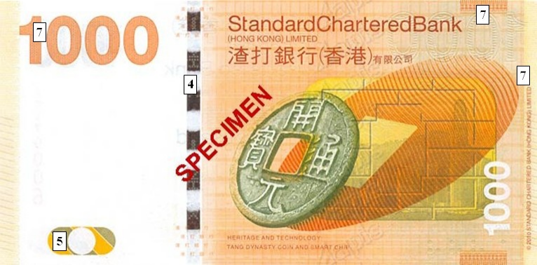 68.2010年版汇丰银行券1000元纸币中,在( )号位处有一个反光图案。垂直观察看不到,倾斜一定角度,可见一金色的汇丰银行行标。