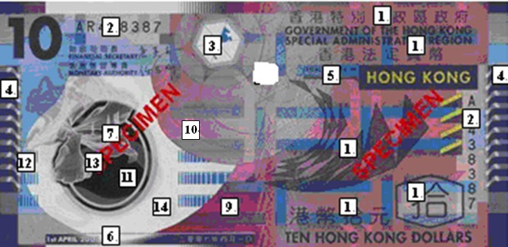 68.2007年版10港元正面( )号位采用凸版印刷技术。用手触摸这两个部位,可以感觉到正面部位凹进去,背面相应的位置则有些凸出来。仔细观察,凸版印刷图案的平线边缘有油墨挤压的痕迹。