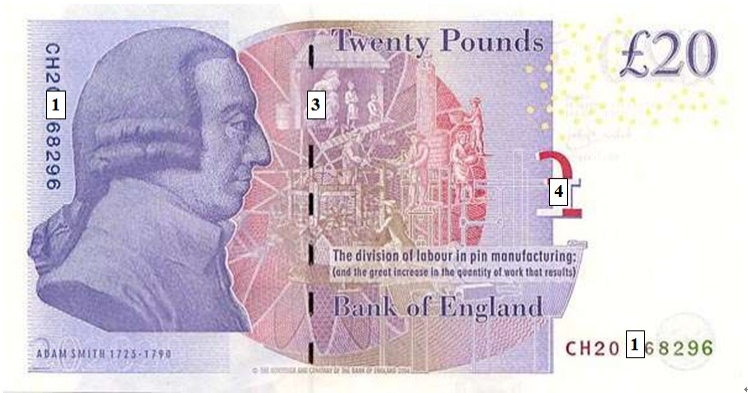 70.用手触摸F序列20英镑纸币( )号位采用凸版印刷技术印制而成,可以感觉到正面部位凹进去,背面相应的位置则有些凸出来。仔细观察,凸版印刷图案的平线边缘有油墨挤压的痕迹。