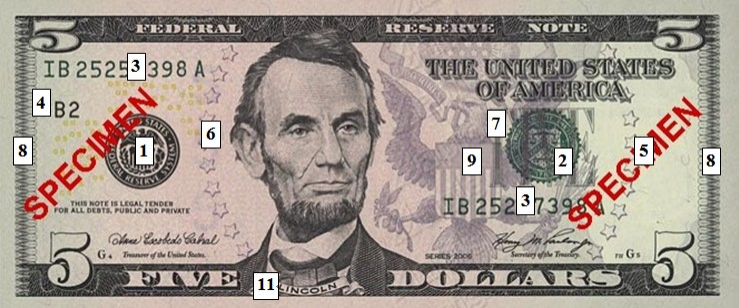 66.彩钞版100美元迎光透视,可见安全线位于肖像左侧4号位,上面交替压印有( ),在钞票两面均可看到。