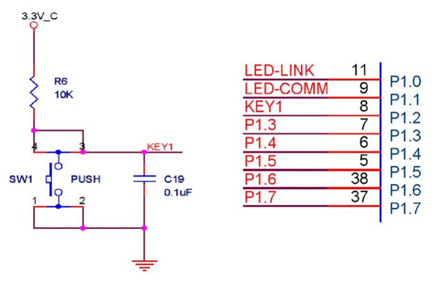 186.如下图所示,SW1按键的一侧(3号、4号引脚)通过一个上拉电阻连接到电源,同时连接到CC2530的( )引脚,另一侧(1号、2号引脚)连接到地。