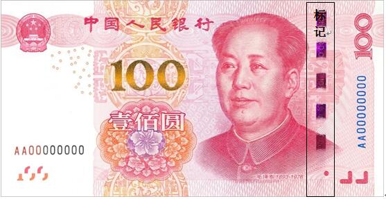 36、下图为2015版100元纸币,标记中防伪特征描述正确的是( )。