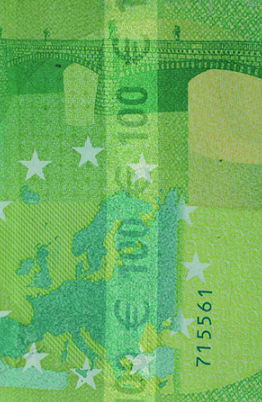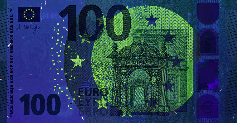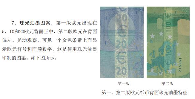 第二版欧元纸币()券别应用了珠光油墨印刷条带。