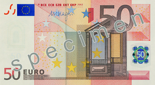 第一版欧元纸币各面额均采用胶印对印图案防伪特征,位于票面的()。
