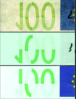 新版”欧罗巴”系列欧元票面正面左下角绿色面额数字”5”在倾斜钞票观察时会产生一道光芒并()移动。