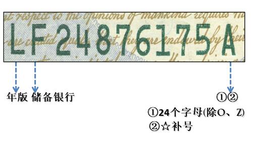 1996年版以后的美元连号位数为11位,前面的第二位字母代表()。