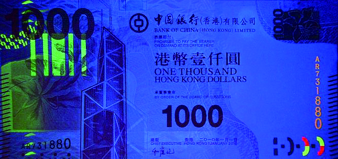 2010系列港币纸币的以下()特征在紫外光照射下会有荧光反应。