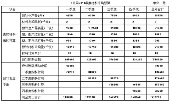 (2)根据资料一的有关资料和资料二,编制材料采购预算.A公司2012年度材料采购预算单位:元