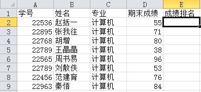 36.在 Excel 2010 中,如下图所示,在工作表中为某计算机专业学生的期末成绩单,期末成绩排在 D 列,则想要得到成绩排名,则可以在 E2 单元格中输入( ),并向下拖动该单元格的填充柄到( )实现降序排列。