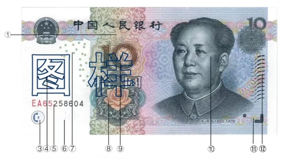 241.单选: 10 元,下列选项中对图片上标⑫防伪特征名称描述正确的是()