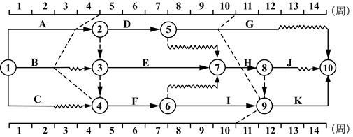 15、下图所示的工程双代号时标网络计划执行到第4周末与第10周末时,检查其实际进度如下图前锋线所示,检查结果表明错误的是( )。