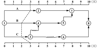 7、某分部工程时标网络计划如下图,当计划执行到第三天结束时检查进度情况,检查结果表明( )。