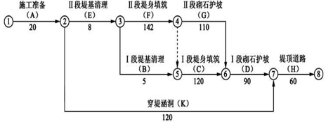 背景资料:发包人与承包人签订堤防加固项目的施工合同,主要内容为堤身加固和穿堤涵洞拆除重建.为保证项目按期完成,将堤身划分成2个区段组织流水施工,项目部拟定的初始施工进度计划如图所示(单位:d).