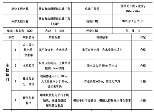 背景资料:某省堤防工程为3级,新建堤防填筑土料为黏性土,最大干密度为1.69g/cm3,最优含水率为19.3%,设计压实干密度为1.56g/cm3.该堤防工程项目划分为一个单位工程,5个分部工程.某省水利水电建筑安装工程总公司承建该工程第Ⅱ标段.第Ⅱ标段为该工程的一个分部工程,堤防长度2.5km,土方填筑量50万m3;其中编号为CS—Ⅱ—016的单元工程桩号为CS10+000—CS10+100,高程为▽18.5m~▽18.75m,宽度为40m,土方填筑量为1000m3.施工过程中发生了如下事件:事件1:施工单位于当年12月进场,当地气温在-5℃左右.土方填筑前,施工单位按照强制性标准的要求对堤基进行了处理.事件2:施工单位按照《水利水电工程单元工程质量验收评定标准》(堤防工程)(SL634—2012)的规定,对CS—Ⅱ—016单元工程质量进行了检查和检测,相关结果填于表1中.