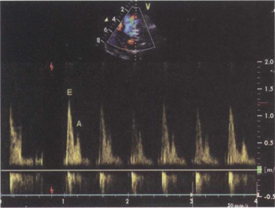 48.患者男性,69岁,胸闷呼吸困难,心电图提示心肌梗死,彩色多普勒二尖瓣舒张期血流速度提示