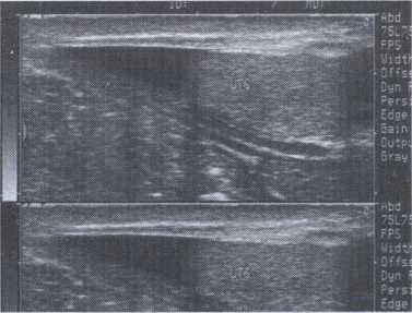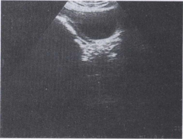 45.男,阴囊肿大,于右侧腹股沟见一混杂回声光团,探头压可回纳腹腔。如图所示,考虑为()