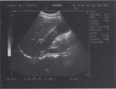 43.女,34岁,上腹疼痛不适数年,加重2天。声像图如图所示。结合超声声像图,诊断为()