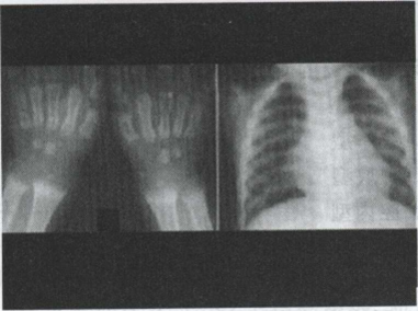 28.男,3岁,腕部变形,胸廓畸形,应诊断为()