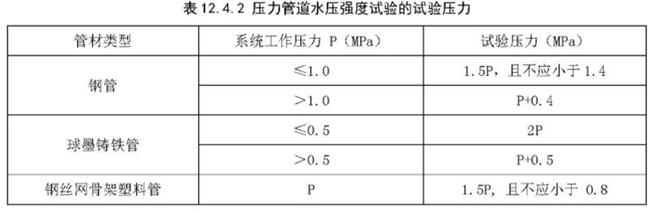 12.4.3水压强度试验的测试点应设在系统管网的最低点。对管网注水时,应将管网内的空气排净,并应缓慢升压,达到试验压力后,稳压30min后,管网应无泄漏、无变形,且压力降不应大于0.05MPa。