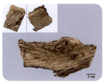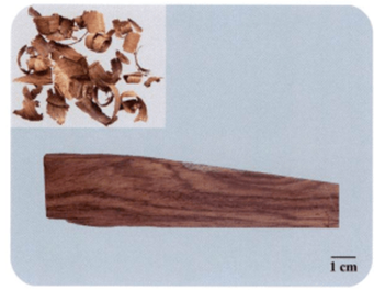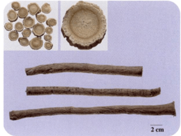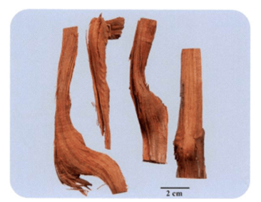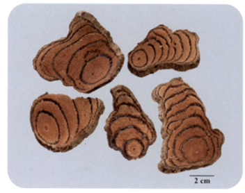 解析:A选项附图所示中药为苏木,为豆科植物苏木的干燥心材;B选项附图所示中药为降香,为豆科植物降香檀的树干和根的干燥心材;C选项附图所示中药为鸡血藤,为豆科植物密花豆的干燥藤茎;D选项附图所示中药为黄芪,为豆科植物蒙古黄芪或膜荚黄芪的干燥根。E选项附图所示中药为葛根,为豆科植物野葛的干燥根。①苏木药材呈长圆柱形或对剖半圆柱形,表面黄红色至棕红色,具刀削痕,常见纵向裂缝,断面略具光泽。②降香饮片为不规则的薄片、小碎块或细粉。表面紫红色或红褐色,切面有致密的纹理。③鸡血藤药材切面韧皮部有树脂状分泌物呈红棕色至黑棕色,与木部相间排列呈数个同心性椭圆形环或偏心性半圆形环,髓部偏向一侧。④黄芪饮片为类圆形或椭圆形的厚片,外表皮黄白色至淡棕褐色,切面皮部黄白色,木部淡黄色,有放射状纹理及裂隙,显“菊花心”。⑤葛根药材呈纵切的长方形厚片或小方块,外皮淡棕色至棕色,有纵皱纹,切面黄白色至淡黄棕色,纤维性强。