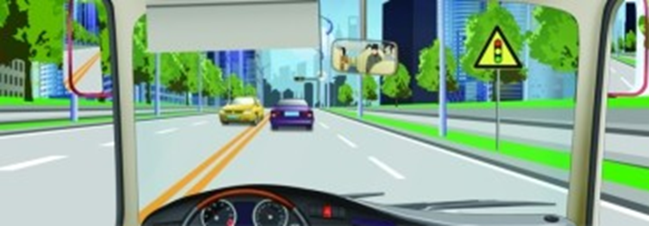 65.驾驶公交车看到图中右侧标志,警告前方路段设有信号灯。