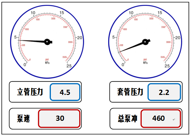 155.[ZJJK08-01-X]已知测得的压井泵速25冲/分钟时的循环立压为3MPa,钻进时发生溢流关井后求取的立压为1MPa,套压为2MPa,环空总容积为3500冲,进行司钻法压井第一循环周操作,现在状态如图所示,此时( )。
