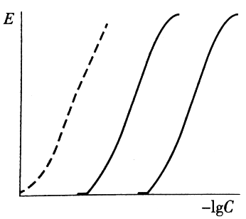 下图为拮抗药的量-效关系曲线图。虚线代表单用激动药的量-效曲线,实线代表拮抗药存在时激动药的量-效曲线图。E代表效应强度,C代表药物浓度。下列描述正确的是