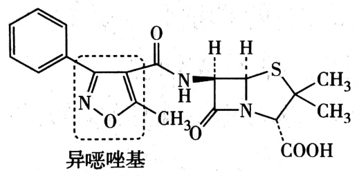 青霉素6位侧链引入3-苯基-5-甲基异噁唑结构,具有较大的体积阻止了药物与β-内酰胺酶活性中心的结合,保护β-内酰胺环不被破坏,成为耐β-内酰胺酶的半合成青霉素类药物是