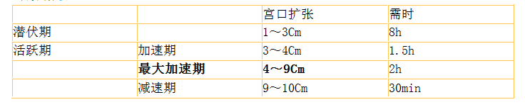 本产妇宫口开大8Cm,说明进入活跃期的最大加速期。由上表可知,所需时间约为:8h+1.5h+2h=11.5h而本产妇规律宫缩11小时,可见,属于正常活跃期。