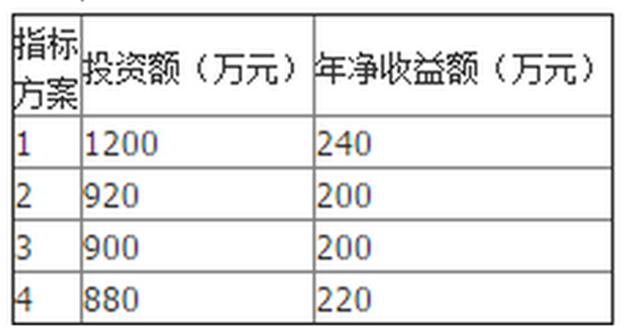 已知某项技术改造西门有四个互斥方案,其投资额和年净收益额如下表所示: