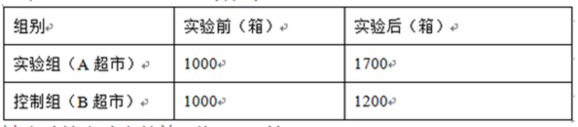 某糖果企业为了调查糖果更换包装的效果,选取A超市为实验组、B超市为控制组,进行控制组实验组对比实验,实验时间为一个月,实验前后的月销售量数据见下表: