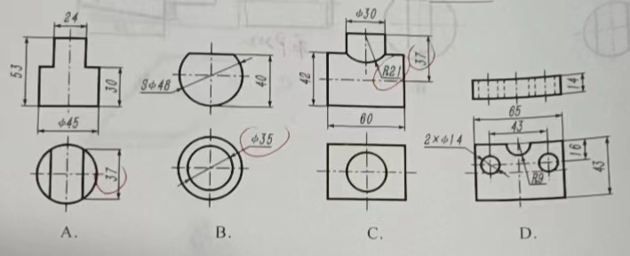 117.(2019年浙江省高职考)下列四组视图中,尺寸标注合理的是( )