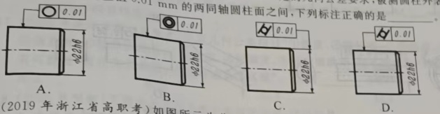 83.(2020年浙江省高职考)∅22h6圆柱外表面具有一定的几何公差要求,被测圆柱外表面必须位于半径差为公差值0.01mm的两同轴圆柱面之间,下列标注正确的是( )