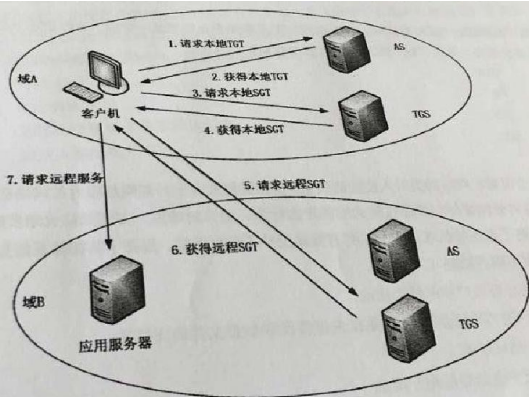 在现实的异构网络环境中,越来越多的信息需要实现安全的互操作。即进行跨域信息交换和处理。Kerberos 协议不仅能在域内进行认证,也支持跨域认证,下图显示的是 Kerberos 协议实现跨域认证的 7 个步骤,其中有几个步骤出现错误, 图中错误的描述正确的是: