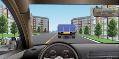 如图所示,你驾车跟车行驶,遇到前方大货车行驶缓慢时,你应如何安全驾驶?