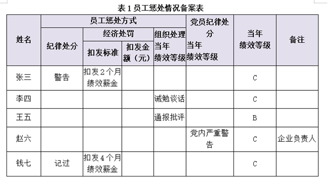 7.表1为某单位报送的员工惩处情况备案表,请结合《国家电网有限公司员工奖惩规定》(国家电网企管〔2021〕63号)、《国网江西省电力有限公司员工年度绩效考核等级评定条件》(赣电人资〔2019〕423号)文件要求,指出存在哪些问题?