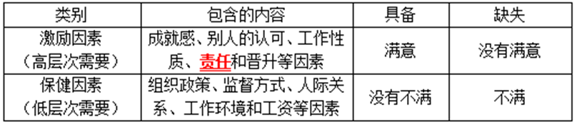 解析:本题考查双因素理论。激励因素具备导致员工满意,A项说法正确;激励因素缺失导致员工没有满意,不是不满,B项说法错误; 双因素理论实践应用:工作丰富化,即员工参与更多的工作规划,自我监督工作进度。C项说法正确;让员工满意和防止员工不满是两回事,D项说法正确。本题为选非题。故此题正确答案为B。【思路点拨】双因素理论的内容可按下表记忆: