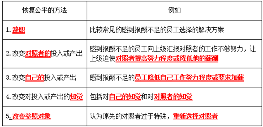 解析:本题考查公平理论恢复公平的方法包括:①改变自己的投入或产出,如选项B;②改变对照者的投入或产出,如选项A;③改变对投入或产出的知觉④改变参照对象⑤辞职,如选项ECD并不属于恢复公平的方法,因此不正确故此题正确答案为ABE。【思路点拨】为方便记忆,可以把恢复公平的五种方法分为两类。前三种方法的共性是当员工感到不公平时采取了实际行动﹔后两种方法的共性是从思想上改变,并无实际行动。