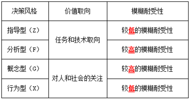 解析:本题考查决策风格价值取向与模糊耐受性可以得到四种不同的决策风格:(1)指导型决策者具有较低的模糊耐受性水平,倾向于关注任务和技术本身。(2)分析型决策者具有较高的模糊耐受性水平以及很强的任务和技术取向。(3)概念型决策者具有较高的模糊耐受性水平,并且倾向于对人和社会的关注。B选项符合题意(4)行为型决策者具有较低的模糊耐受性水平,倾向于对人和社会的关注。故本题正确答案为B。【思路点拨】模糊耐受性可以理解为对环境确定性的承受能力。低模糊耐受性指在有明确标准和步骤的情况下完成工作。高模糊耐受性指在没有明确标准的情况下,在不确定的环境中作出自己的判断,完成工作。