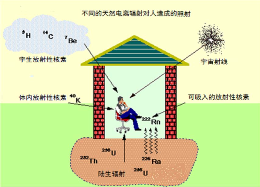 70、人类在地球一直受到天然辐射源的照射,关于下图中天然辐射的来源说法正确的是()。
