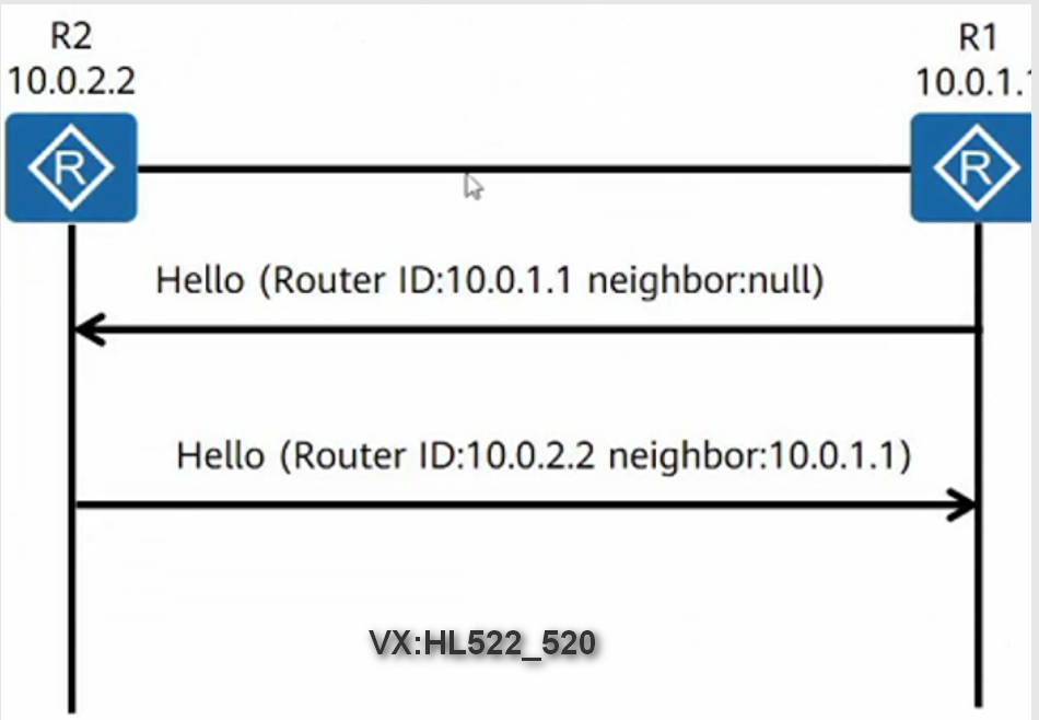 446.如图所示的网络,R1和R2运行OSPF协议,R1的Router-ID为10.0.1.1,R2的Router-ID为10.0.2.2。当R1收到 R2发送的OSPF报文后,此时R1的邻居状态为?(网络IP知识点)