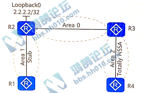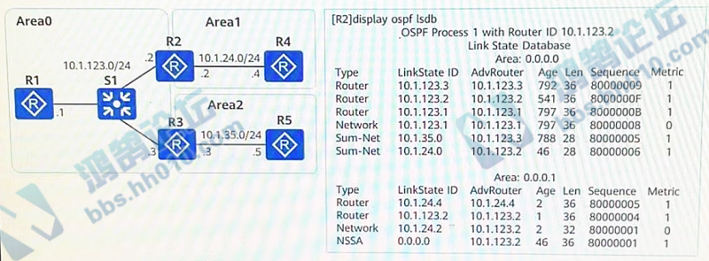 347.如图所示,某网络部署OSPF实现网络互通,其中Area1部署为Stub区域,Area2部署为Totally NSSA区域,R2的环回门Loopback 0未开启OSPF,若在R2的OSPF进程内通过命令import-route direct将环回门地址引入到OSPF网中,使得其他设备可以访间该环回口地址,则R4会收到以下哪些由R3发布的LSA?