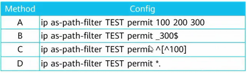 313.网络管理员A想使用AS-Path Filter配出BGP路由属性AS_PATH[100 200 300]的路由条目,网络管理员A梳理出图中的四种配置,请问以下哪些配置可以满足网络管理员A的要求?