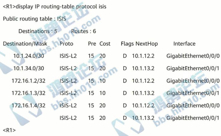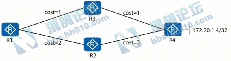 315.R1、R2、R3、R4都属于OSPF区域0,链路的cost如图所示。R1、R2、R3、R4的Loopback0通告入OSPF。R1、R2、R3与R4使用Loopback0作为连接接口,建立IBGP对等体关系,R1、R2、R3是R4的客户端。R4的直连网段172.20.1.4/32通告入BGP。关于R1访问172.20.1.4/32的流量走向,分析正确的是?