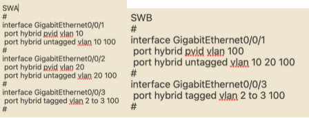 Interface Vlanif10Ip address 10.0.12.1 255.255.255.0Interface GigabitEthernet0/0/2Port link -type trunkPort trunk pvid 10Port trunk allow-pass vlan 10