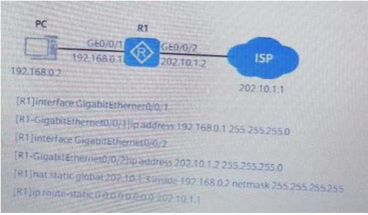 482.如图所示,路由器 R1 上部署了静态 NAT 命令,当 PC 访问互联网时,数据包中的目的地址不会发生任何变化。