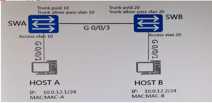 572.如下图所示网络,交换机 A 和交换机 B 连接主机的端口分别属于 VLAN 10 和 VLAN 20,交换机互联的端口类型为Trunk,PVID 分别为 10 和 20,下列说法正确的有?