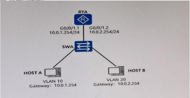593.如图所示,两台主机通过单臂路由实现 VLAN 间通信,当 RTA 的 G0/0/1.2 子接口收到主机 B 发送给主机 A 的数据帧时,RTA 将执行下面哪项操作?