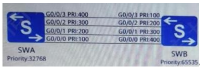532.下图中所有交换机都开启了 STP 协议,假设所有端口的路径开销值都为 200,则 SWD 的 G0/0/4 端口收到的配置BPDU 报文中包含的根路径开销值是多少?